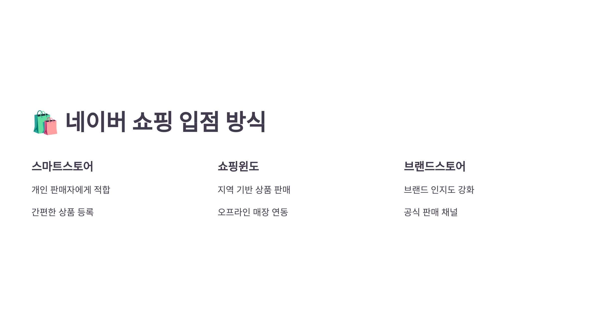 | 🛒 스마트스토어 | 네이버에서 직접 운영하는 입점형 쇼핑몰 플랫폼 | 개인, 소규모 사업자 |